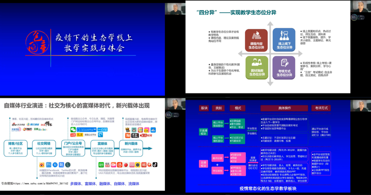 会议首先邀请公司包国章教授做了题为“疫情下的生态学线上教学实践与体会”的教学报告。包老师是国家精品在线开放课程、国家级一流本科混合式课程、国家精品视频公开课、中国大学素质教育精品通选课及全国工程硕士课程负责人。包老师的报告分别从教学创新、针对疫情的教学实践以及如何融入课程思政三个方面分享了线上教学的创新理念和创新实践。介绍了教学中心及考学关系的转变、讲课层次的提升、关联式教学、激励手段的多样化,分析了疫情期间课程录制、课堂生态及教学心理特点,展示了课程思政的“一中心、二层次、三结合”融入原则。