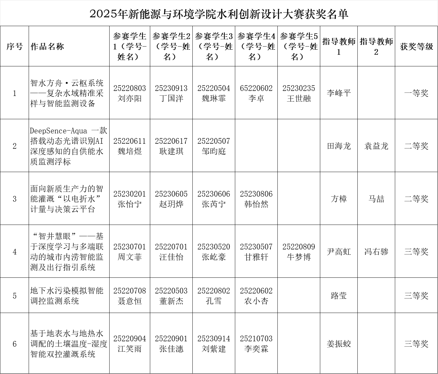 根据《关于举办第九届全国老员工水利创新设计大赛的通知》(水教协[2025]8号)要求,伟德bv国际体育于2025年5月8日组织了水利创新设计大赛院赛,对本次申报的6个作品进行了评审,确立一等奖1项,二等奖2项,三等奖3项,确定推荐《智水方舟·云枢系统——复杂水域精准采样与智能监测设备》、《DeepSence-Aqua 一款搭载动态光谱识别AI深度感知的自供能水质监测浮标》、《面向新质生产力的智能灌溉“以电折水”计量与决策云平台》三个作品参加国赛,现予公示。