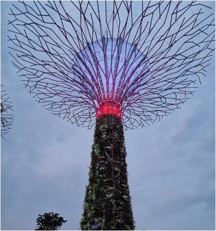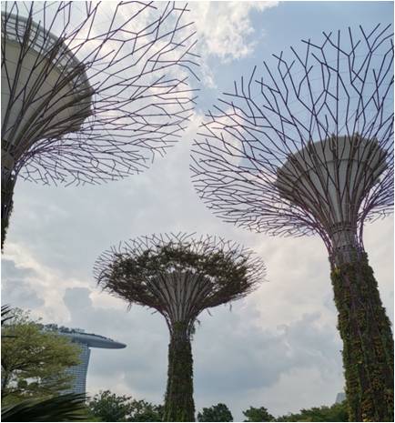 在滨海湾花园,同学们还看到了矗立在滨海湾花园中央的人造“参天大树”,其中两棵“参天大树”内径是两个烟囱,与滨海湾花园地下的垃圾处理装置相连,最终垃圾处理过程中的产生的气体经过净化全部变为二氧化碳,经由“参天大树”排放到室外,实现滨海湾花园区域垃圾的“自产自销”。新加坡用他自己的方式表达着人与自然的和谐相处之道,为我们描绘了一幅“碧波荡漾,绿水环绕”的唯美画卷。对比于国内生活垃圾处理主要还是以填埋的方式,焚烧所占的比例非常小,而能将其建筑成可供游客游览的旅游景点更是微乎其微,这值得国内学习和借鉴。