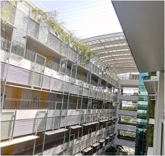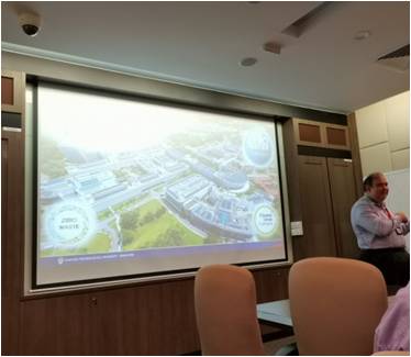 10月30日代表团访问了NEWRI(Nanyang Environment & Water Research Institute)大楼,楼内覆盖着郁郁葱葱的热带特有植物,同时楼顶设置了大面积的太阳能电池板,为楼内工作生活提供电能,体现了NEWRI的节能与可持续理念。NEWRI是南洋理工大学2008年针对新加坡水资源缺乏的情况成立的致力于环境和清洁水技术的研发中心。目前NEWRI已将其跨学科研究成果应用到工业和相关社区发展,被誉为全球九个著名水资源研究机构之一。