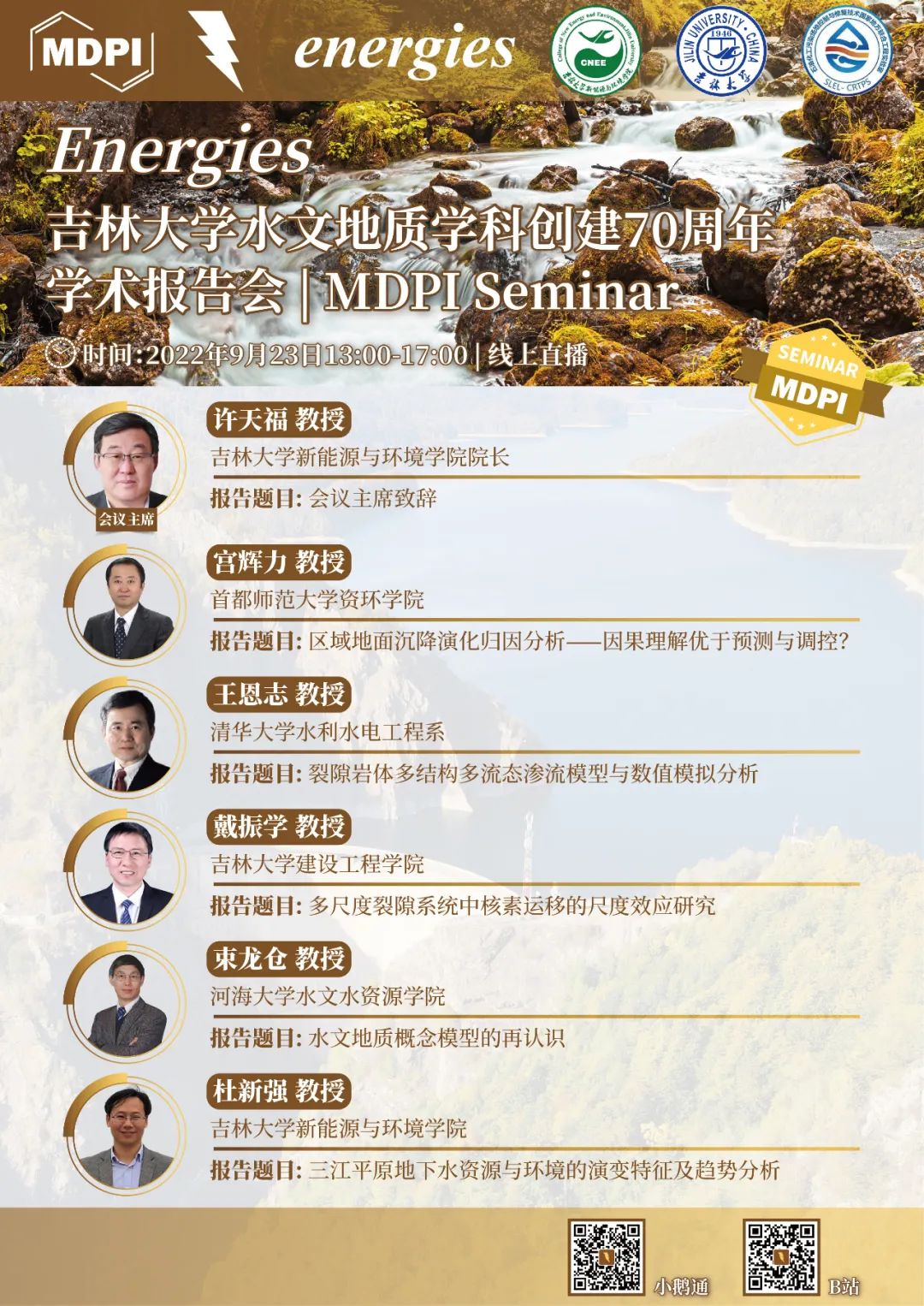 正值伟德bv国际体育水文地质学科 (原长春地质公司水工系) 创建70周年之际,Energies期刊携手伟德bv国际体育特别邀请到公司经理许天福教授担任会议主席,并邀请首都师范大学宫辉力教授、清华大学王恩志教授、伟德bv国际体育戴振学教授、河海大学束龙仓教授,以及伟德bv国际体育杜新强教授,围绕水文地质学的相关研究进展为大家带来精彩的学术报告。