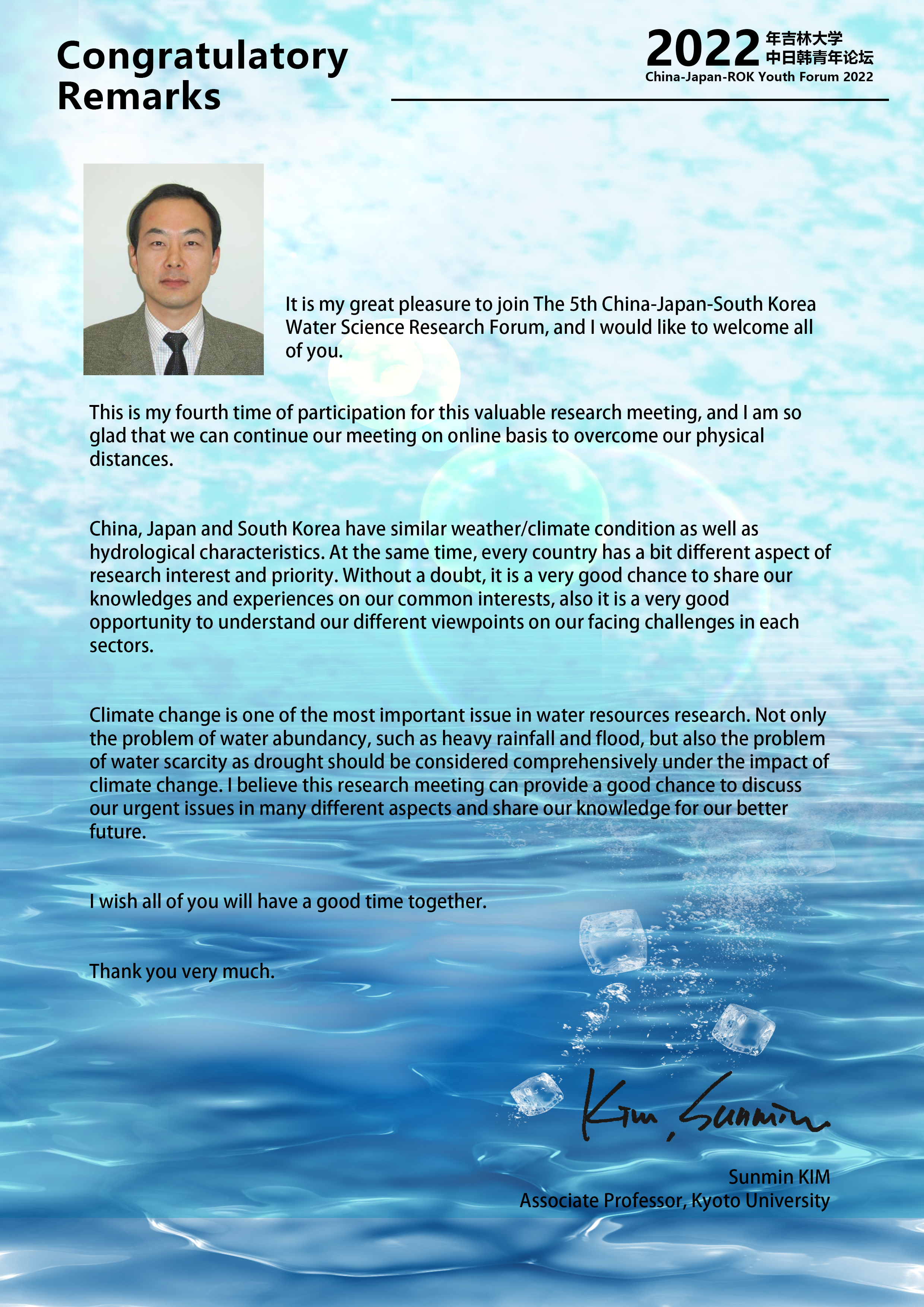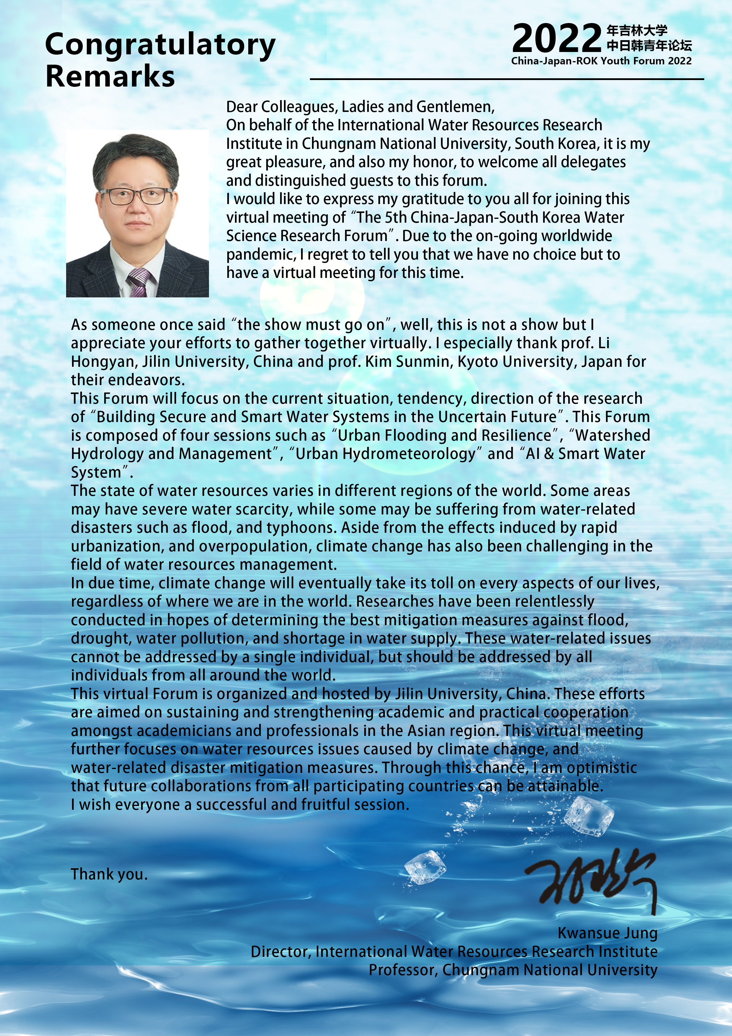 由伟德bv国际体育主办,韩国忠南国立大学、日本京都大学协办的第五届中日韩水科学研究论坛将于2022年11月19—20日以线上会议方式召开,围绕伟德bv国际体育“中日韩青年论坛”,以“Building Secure and Smart Water Systems in the Uncertain Future”为主题,聚焦专业前沿性问题,为变化环境下水资源合理开发利用和保护提供对策。