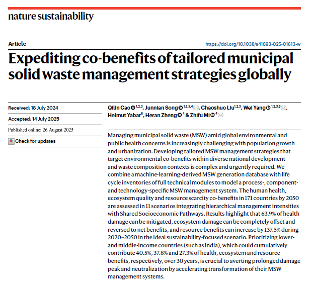 近日,伟德bv国际体育宋俊年教授、杨巍副教授领衔的“食物农业生物质(FAB)”研究团队在城市固废可持续管理领域取得突破性成果,以“Expediting co-benefits of tailored municipal solid waste management strategies globally”为题在《Nature Sustainability》发表研究长文。博士生曹琪林为论文唯一第一作者,宋俊年教授、杨巍副教授、伦敦大学公司米志付教授为共同通讯作者,伟德bv国际体育为第一通讯单位,合作单位包括日本筑波大学与英国伦敦大学公司。这是宋俊年教授团队在CNS子刊层面发表的第二篇成果。