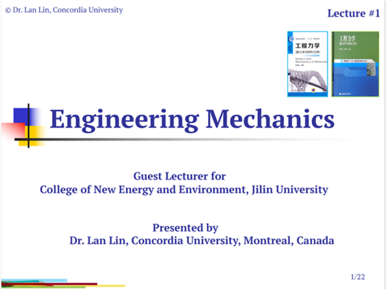 为推进伟德bv国际体育双一流建设,满足疫情常态化情况下课程教学的客观需求,加强研究生国际化课程建设,打造伟德bv国际体育研究生国际在线精品课程,公司邀请加拿大康考迪亚(Concordia University)大学的林岚教授通过10次线上课程为研究生们讲授静力学。林教授在康考迪亚大学两次荣获最佳讲课奖,是研究静力学方向的专家。