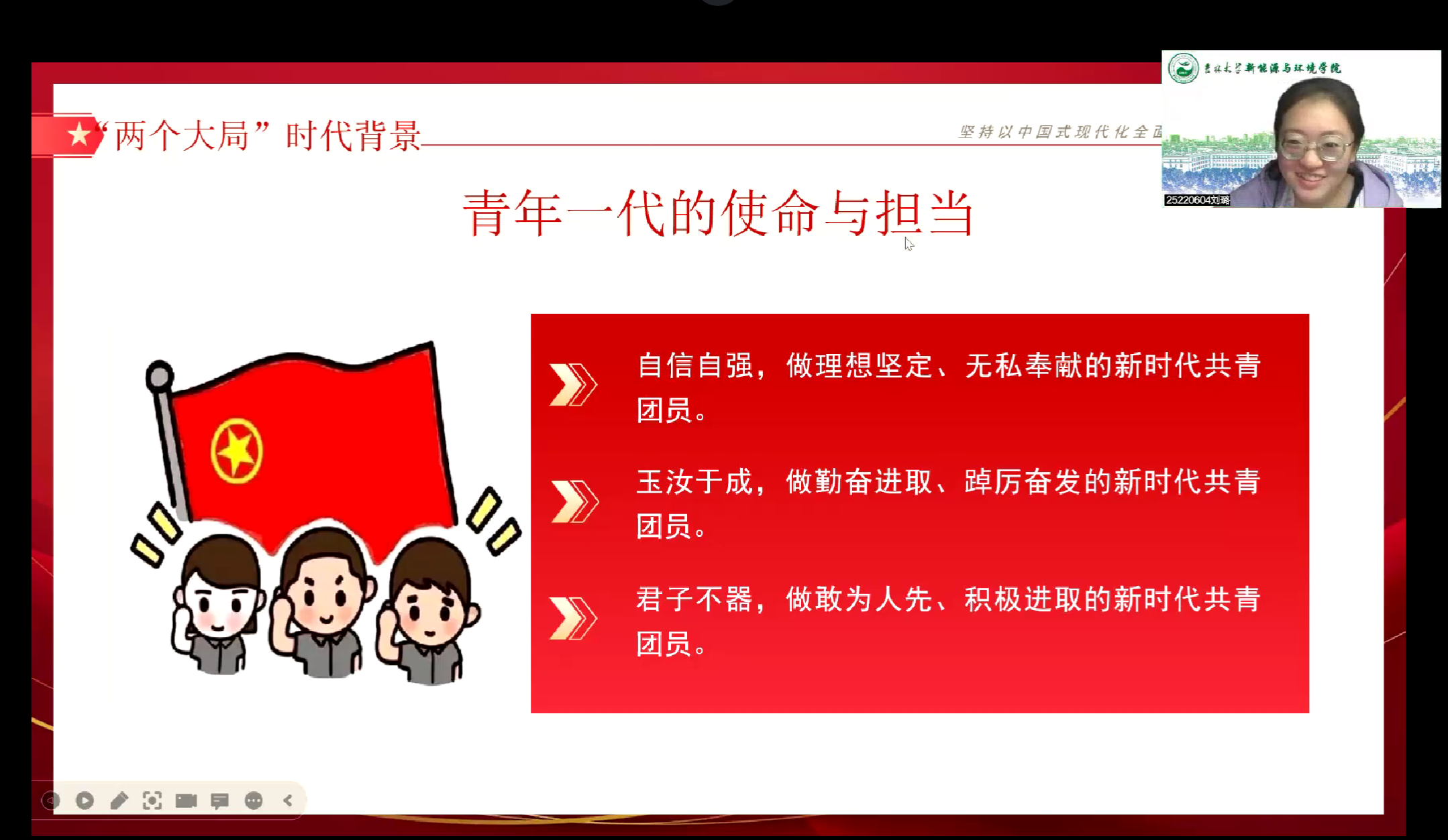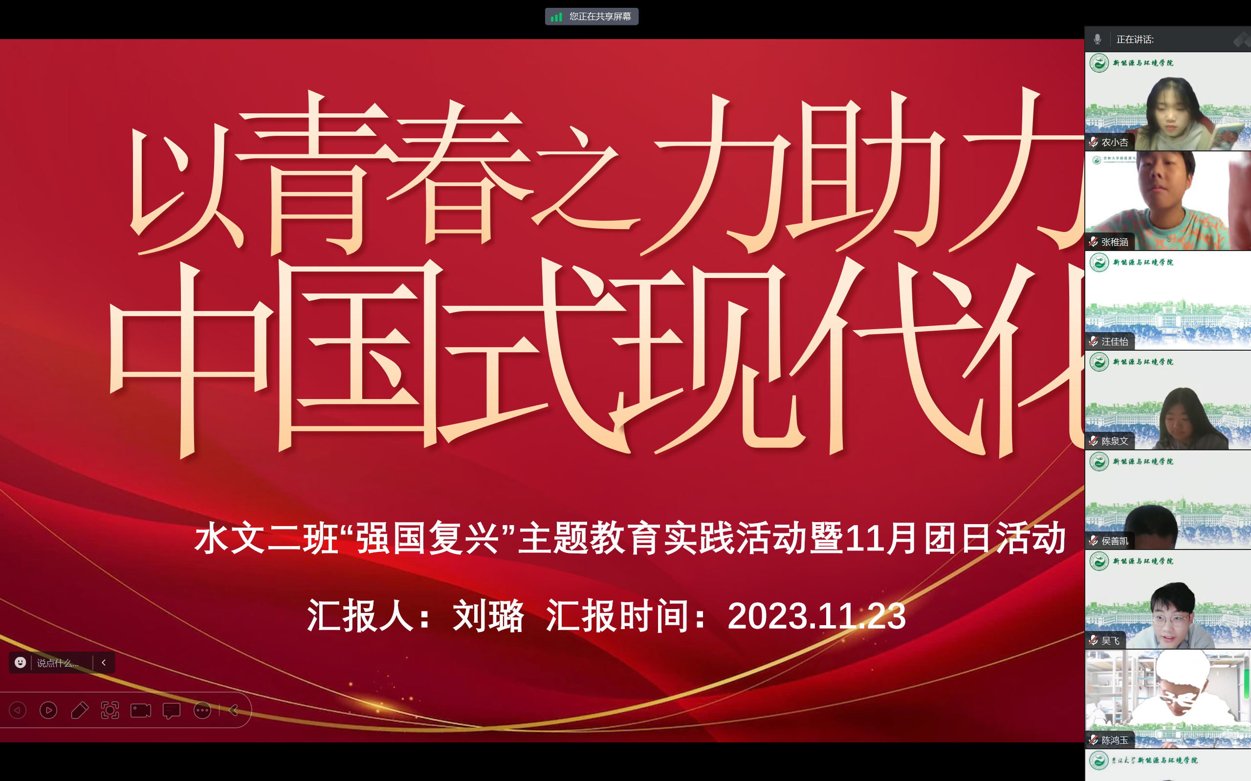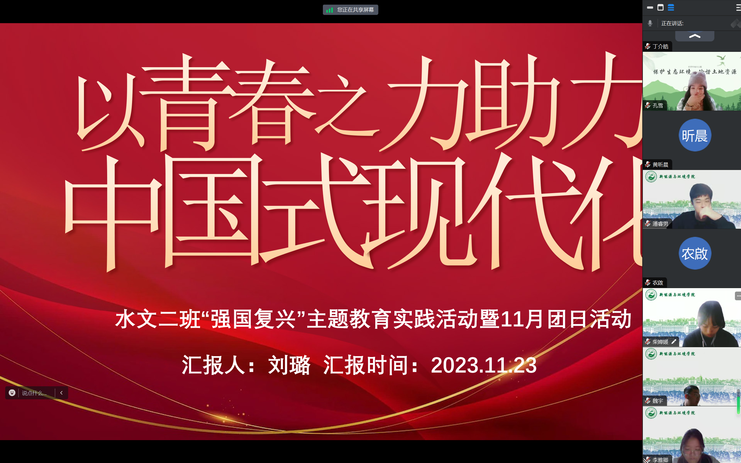 为了让广大青年员工树立起远大理想,深刻理解共产主义青年团的性质和宗旨,厚植爱党、爱国、爱社会主义的情感,更加自觉地以习近平新时代中国特色社会主义思想武装头脑,为实现中华民族伟大复兴的中国梦凝聚起强大青春力量,2023年11月23日12时伟德bv国际体育252226班的同学们在团支书刘璐的带领下,于腾讯会议线上召开了“强国复兴”主题教育实践活动暨11月团日活动,届时全体团员参会。本次团日活动的开展形式为集中学习讨论,采用“团员主讲,支书帮讲”的形式开展座谈会,提高同学们学习思考的积极性。