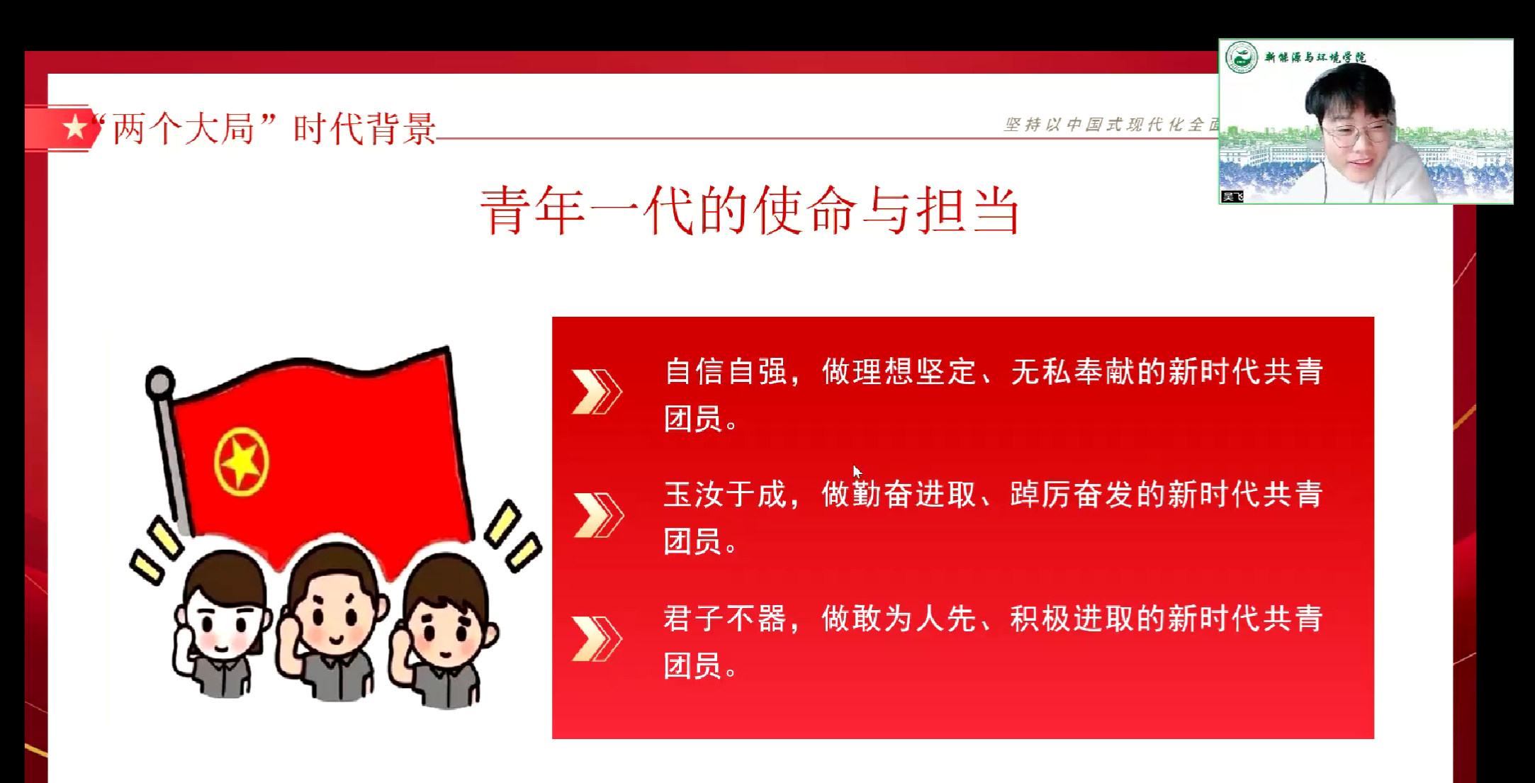 团员25220602农小杏、25220603陈泉文、25220601李雅卿、25220807柴婵媛、青年25220810张稚涵则从青年应当保持自信自强的姿态,坚守理想信念,无私奉献社会这一方面展开他们的分享:新时代中国青年生逢盛世、共享机遇。拥有更高质量的发展条件,获得更多人生出彩机会,享受更全面的保障支持。新时代中国青年素质过硬、全面发展。理想信念更为坚定,身心素质向好向强,知识素养不断提升,社会参与积极主动。新时代中国青年勇挑重担、堪当大任。在平凡岗位上奋斗奉献,在急难险重任务中冲锋在前,在基层一线经受磨砺,在创新创业中走在前列,在社会文明建设中引风气之先。新时代中国青年胸怀世界、展现担当。更加开放自信地融入世界,展现构建人类命运共同体的青春担当,中国青年的全球行动倡议。