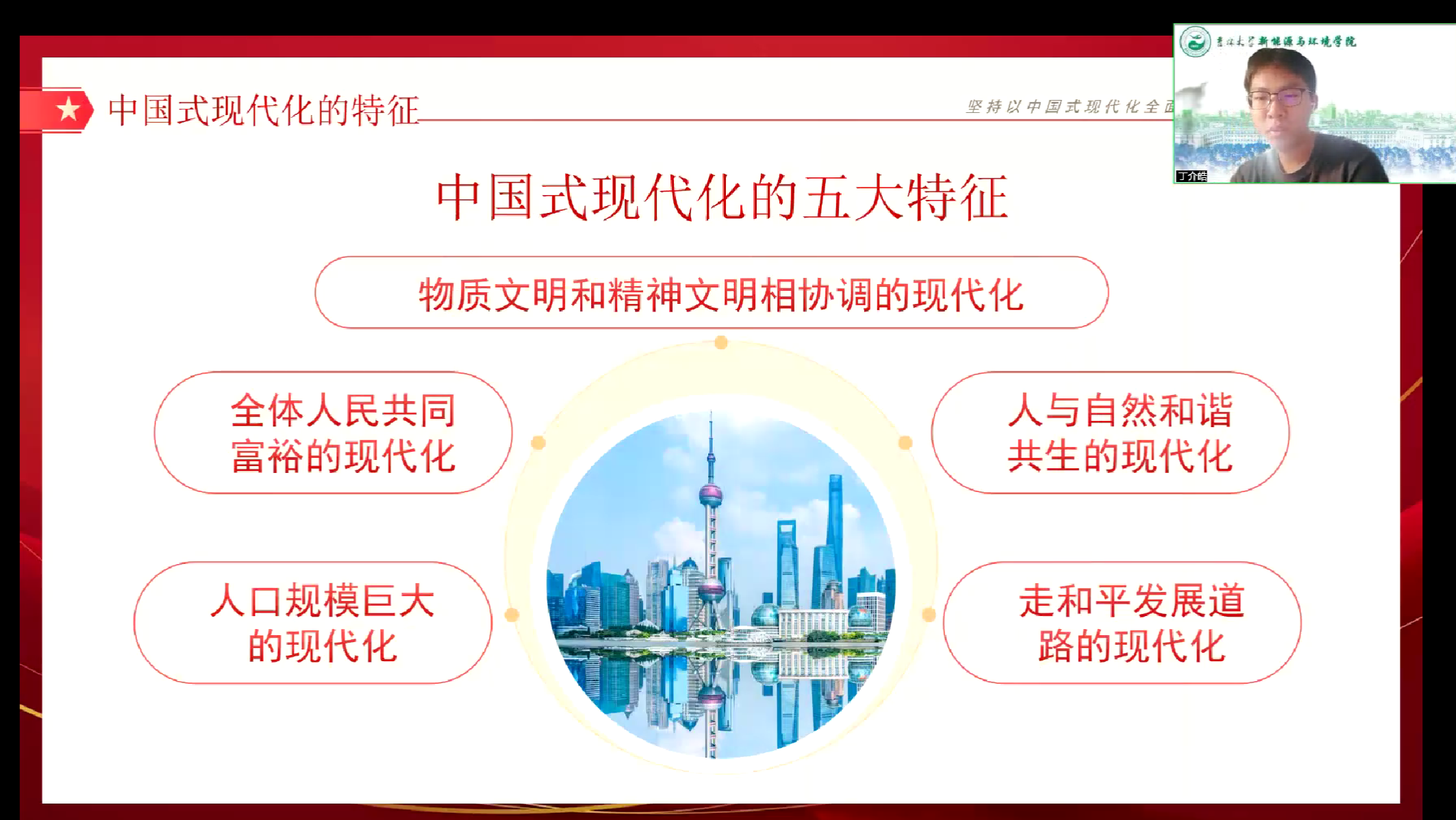 团员25220610丁介皓:中国特色社会主义国家的基本特征:第一个走和平发展的道路。第二个是人与自然和谐共生。第三个是坚持创新在现代化建设全局中的核心地位。第四个是物质文明和精神文明的协调发展。第五个是绿族人口规模最大的国情,实现共同富裕。看得出他进行了比较充分的准备,随后团支书刘璐对每一特征进行了举例说明让大家更加充分的理解。