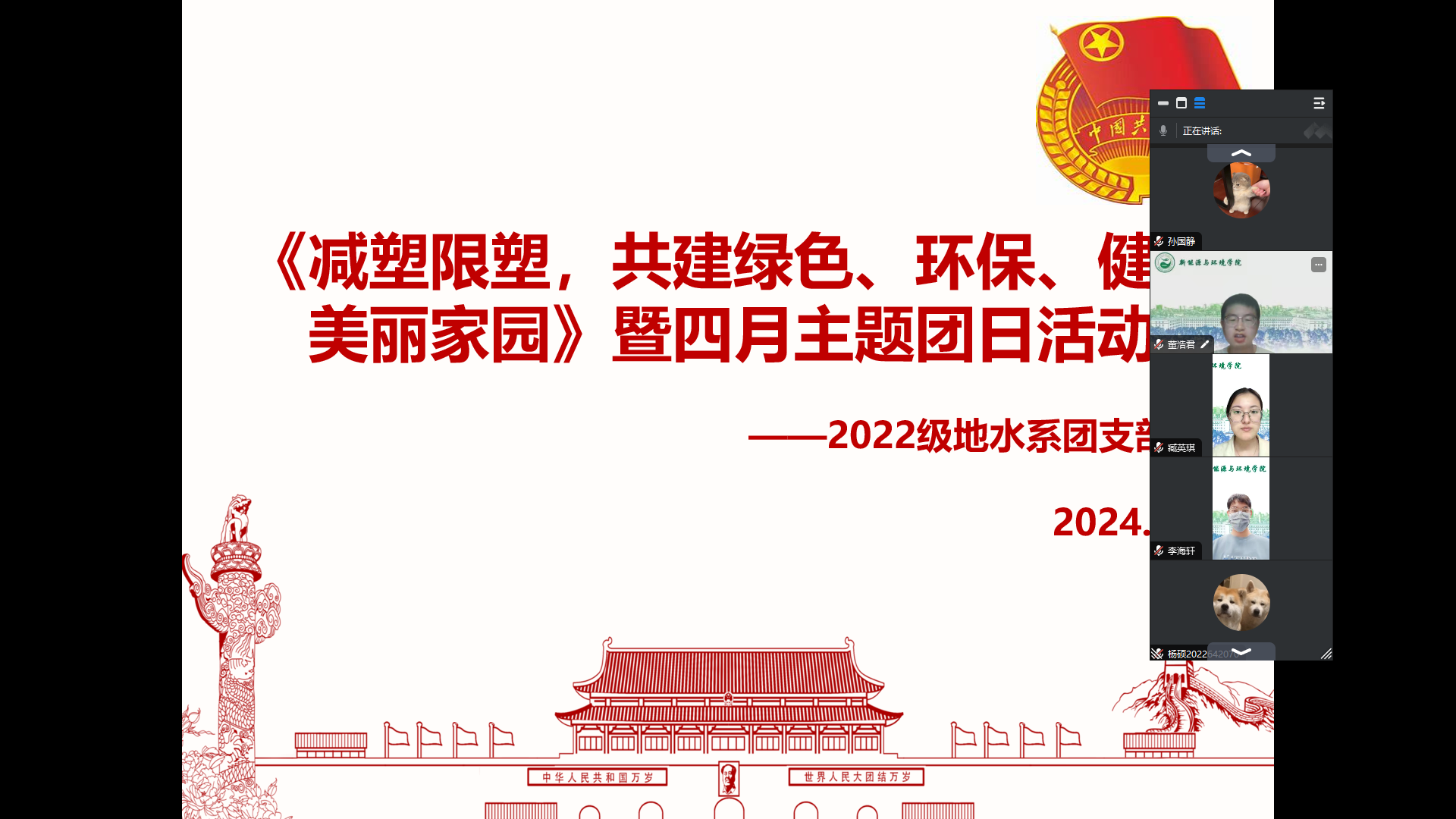 首先,团支部书记播放了由CGTN发布的《中国的“限塑之路”》视频。通过观看视频大家了解到,自1950年至2015年,全球人类共生产了83亿吨塑料制品,其中79%的塑料垃圾被丢弃,12%被焚烧,仅有9%的塑料垃圾被回收再利用。而中国是全球最大的塑料生产国,同时也是塑料制品消费大国。这些塑料垃圾会以微塑料的形式轻易地进入生态系统和食物链中,逐渐累计并严重危害人类的身体健康。但随着中国向一次性塑料宣战,如今国内使用一次性塑料制品的现象大幅减少。虽然“限塑之路”道阻且长,但在全人类的共同努力下终结塑料污染是可以实现的!