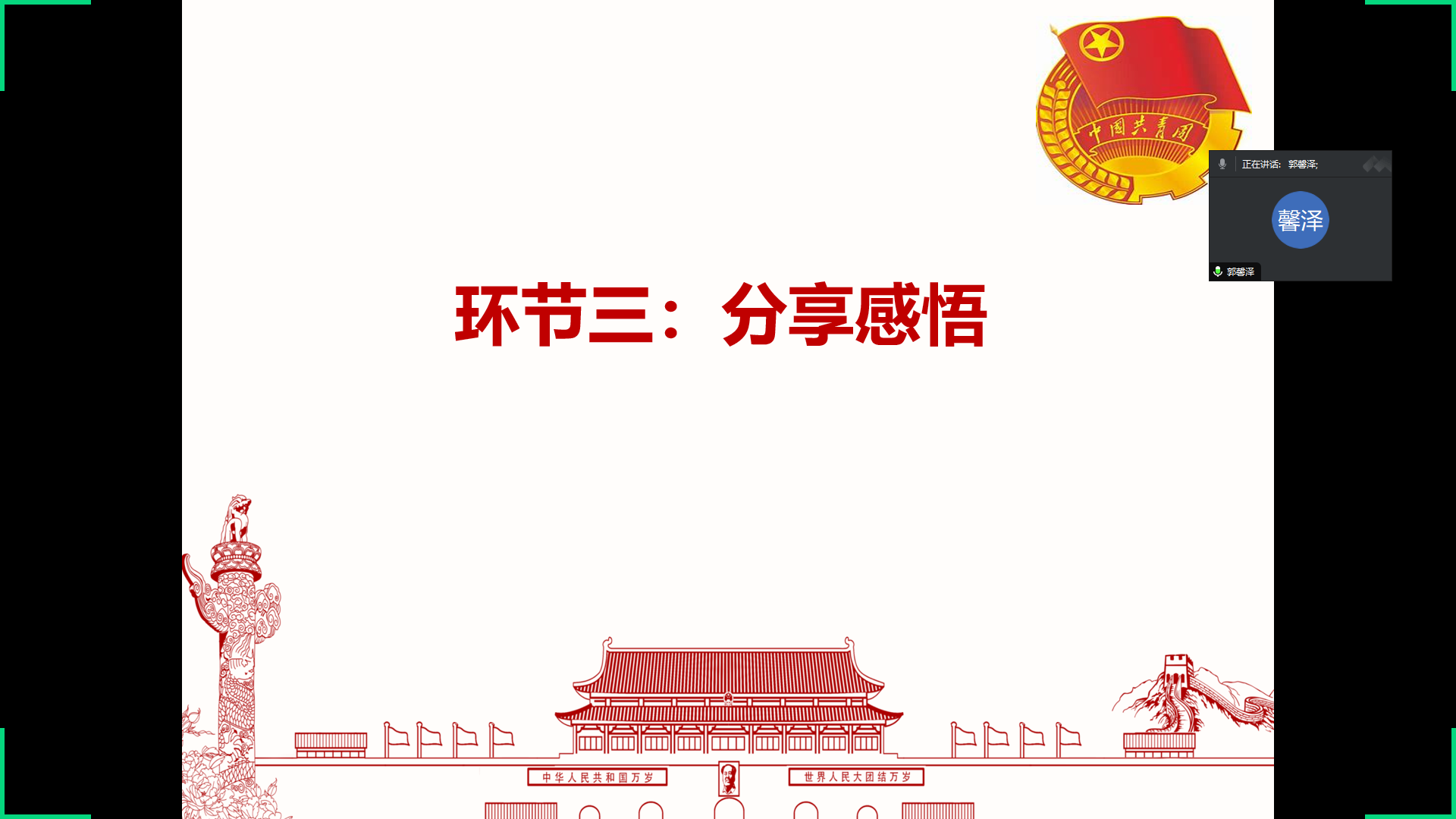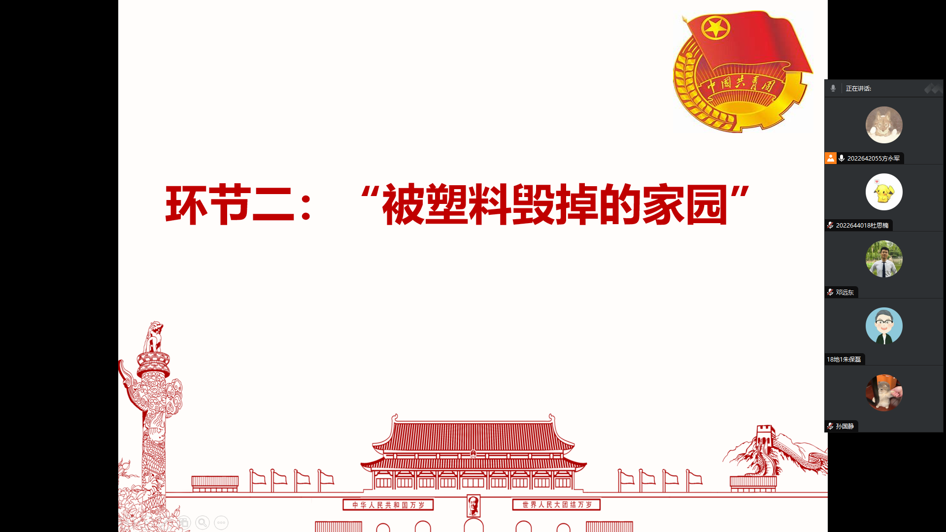 然后,团支部书记播放了由联合国环境规划署合作的公益广告:《被塑料毁掉的家园》。本片跟随一个孩子的视角,通过她用塑料瓶制成的望远镜观察我们被塑料污染的未来,希望可以提高人们的认识并推动采取行动结束全球的塑料污染。