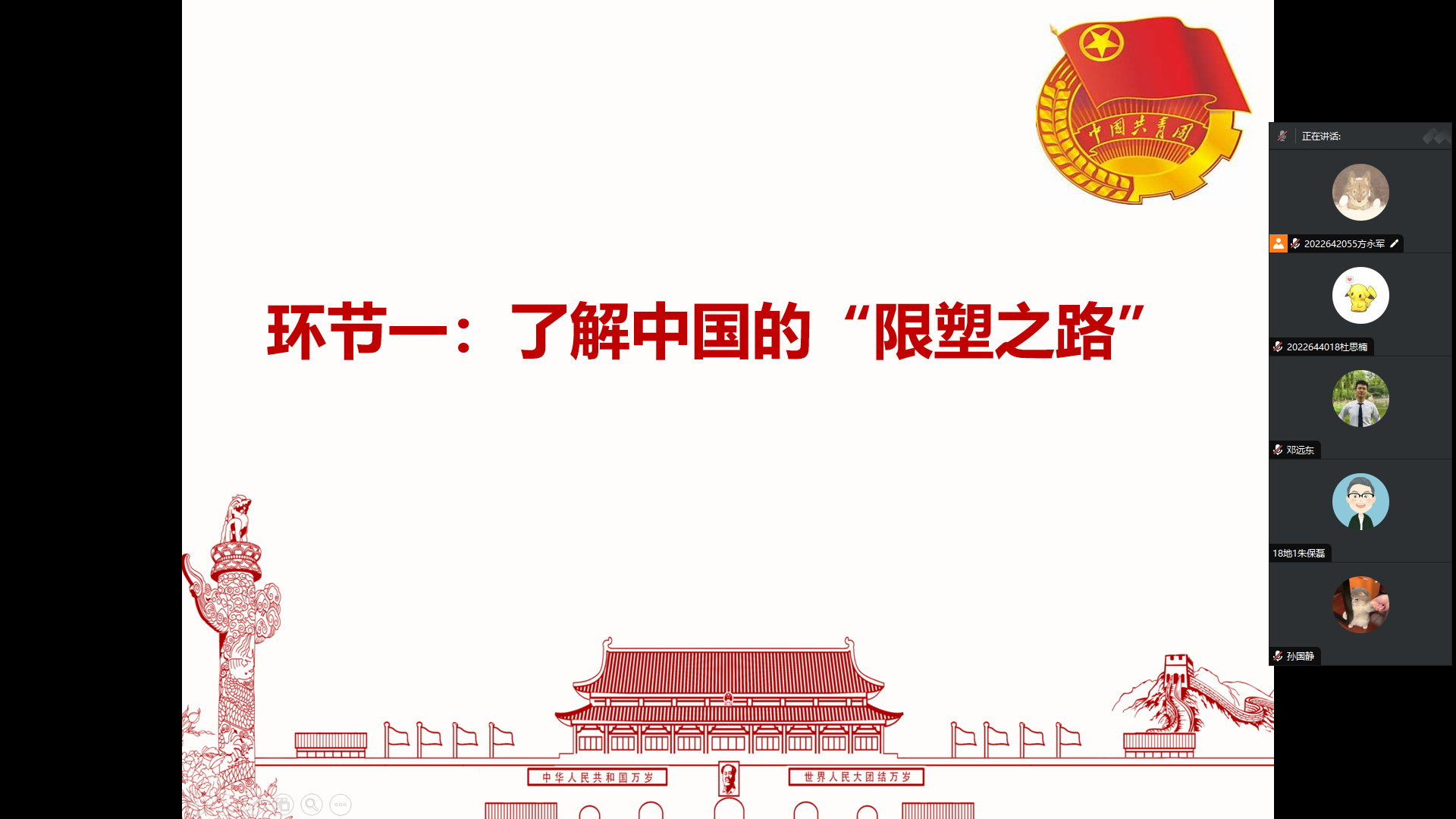 本次主题团日活动主要包括观看视频《中国的“限塑之路”》、公益广告《减少一次性塑料使用》和团支部成员分享感悟3个环节。