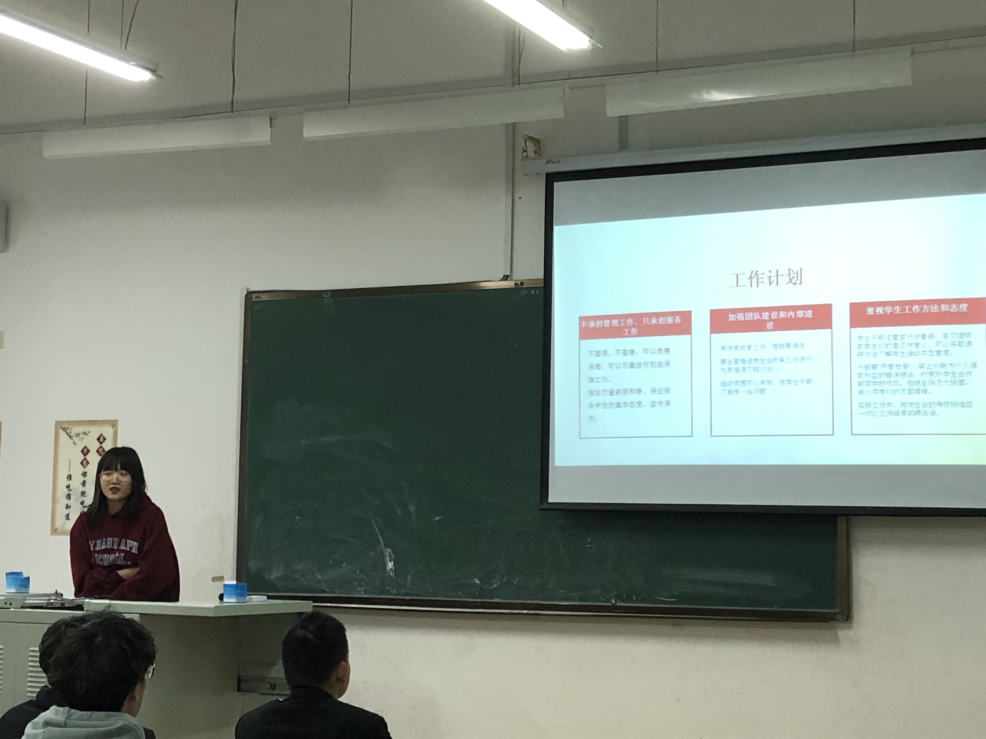 随后,学习会就公司接下来的工作安排发布了详细的任务说明,要求做到不承担管理工作,只承担服务工作。同时,要加强团队建设和内部建设并重视员工工作的方法和态度,力求一切以工作结果成绩说话,保证服务员工的基本态度,坚守原则。大会的最后一项议程,院员工会主席团成员分别就各自所负责的板块进行了自我想法的阐述。牛梦圆同学从团委员工会成果分享大会的积极性问题出发,借用自己的服务经历讲述了员工会工作的初心和原则。张舜尧同学则就综合事务部面对可能存在的作风问题必须“防微杜渐、绝不涉足”的原则进行了强调。紧接着,孙嘉鸿同学又在员工活动的宣传方面发表了自己的看法,希望大家在员工会的各项活动上共同协作,力求尽善尽美。