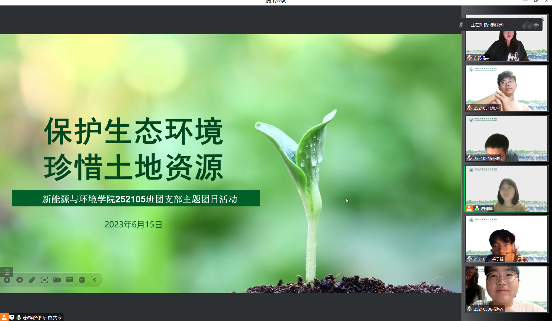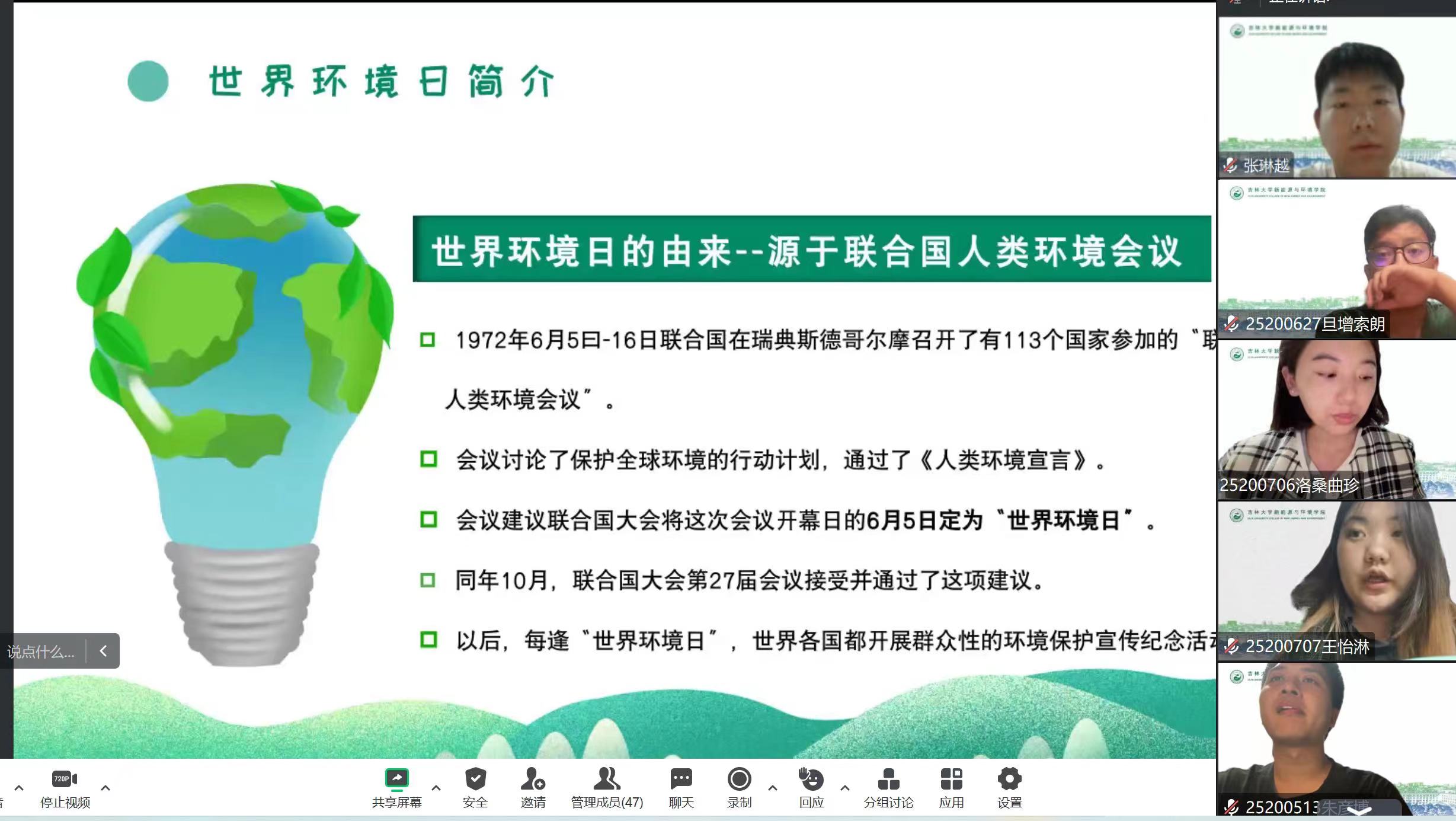 252027班团支书讲解了世界环境日的提出是为了纪念第一次人类环境会议并通过了著名的《人类环境宣言》