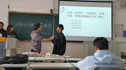 252122班班会选择在教室展开。同学们进行了一轮趣味小游戏,游戏中被淘汰的同学在多样的惩罚措施中选择其中一种接受惩罚。游戏结束后,全班同学都投入到了制作扭扭棒的活动中,共同享受这段班级的欢乐时光。