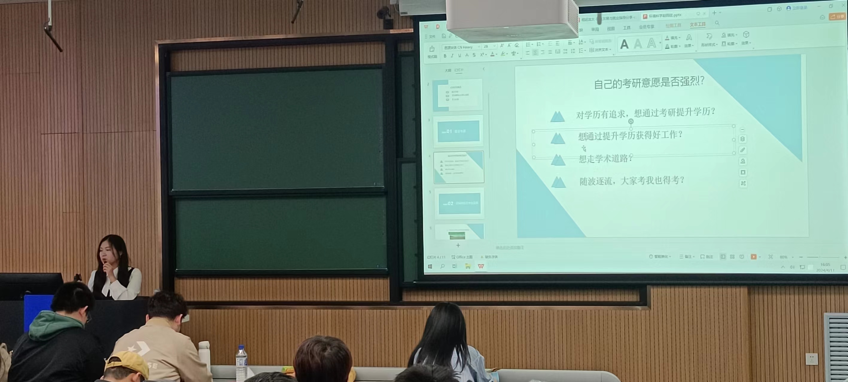 会上,几位主讲人以自身为例分别讲解了公务员考试的备考时间线、选岗经验、笔面试准备;介绍了如何正确选取考研复习资料,合理规划备考安排,积极调整备考心态;分享了如何树立目标院校、准备简历材料、联系意向导师;解答了考研过程中可能遇见的分析院校、申请调剂、心态调整等各种实际困难。四位学长的分享各有侧重,讲解中“干货”满满掌声不断,现场的同学们意犹未尽。