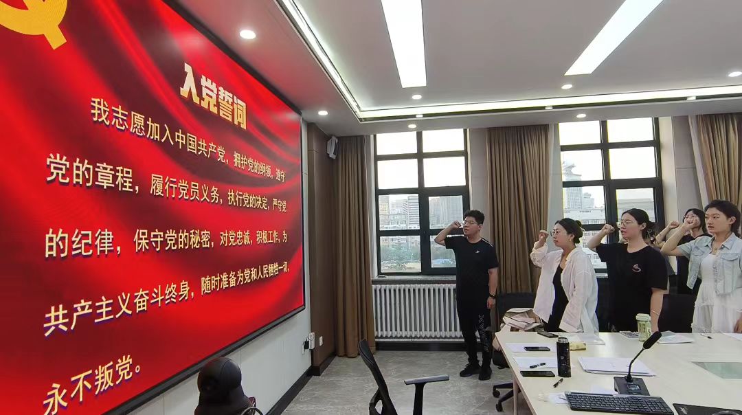 为迎接第103个中国共产党的诞辰纪念日,强化党员身份认同感,党员转正大会后,支部副书记姜岳彤同志带领全体党员重温入党誓词,面对党旗庄严宣誓。这也是17名新发展党员的入党宣誓仪式,在老党员们的带领下,17名同志一起面向党旗,右手握拳,站姿挺拔,庄严宣誓,用铿锵的誓言和坚定的眼神向党组织许下庄严承诺。