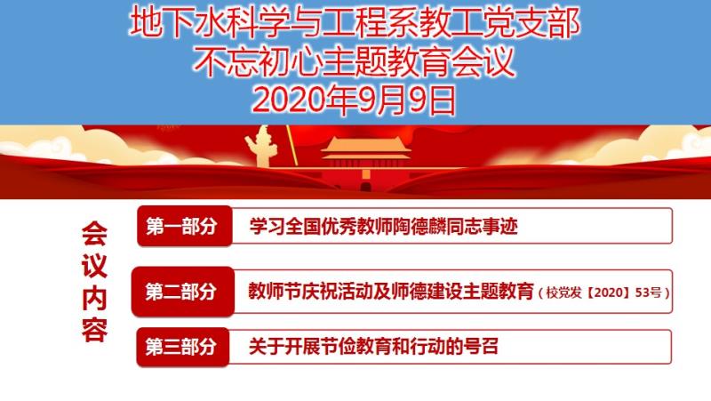 2020年9月9日下午,值第36个教师节来临之际,地下水科学与工程系教工党支部召开全体党员会议,会议采取钉钉网上会议形式举行。主要内容包括三个部分:1.集中学习全国优秀教师陶德麟同志的先进事迹;2.学习落实公司教师节庆祝活动和师德建设主题教育通知(党委教师工作部,2020年9月1日)的精神;3.关于开展节俭教育和行动的号召。