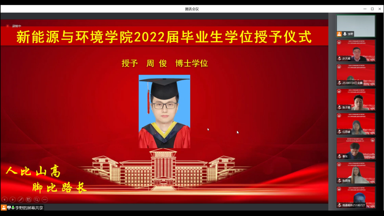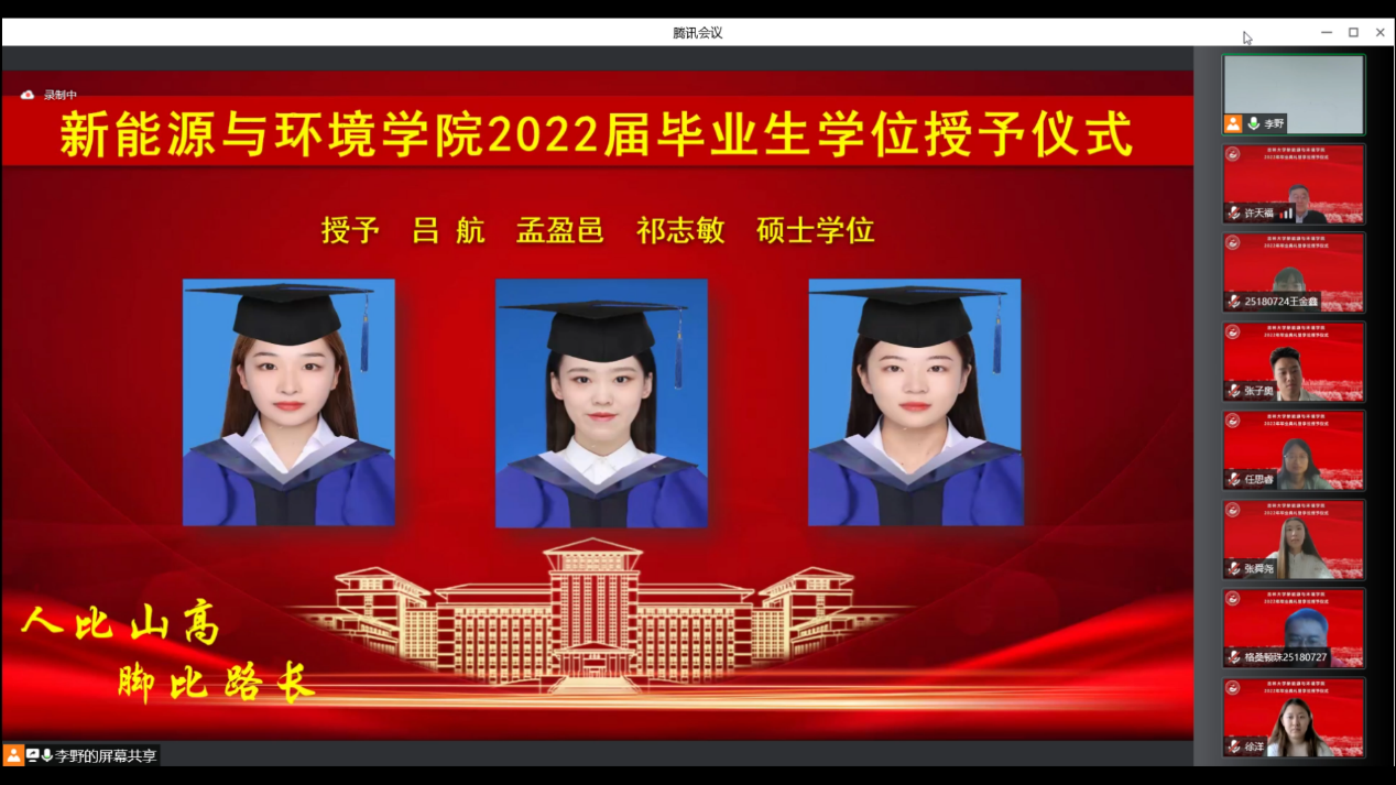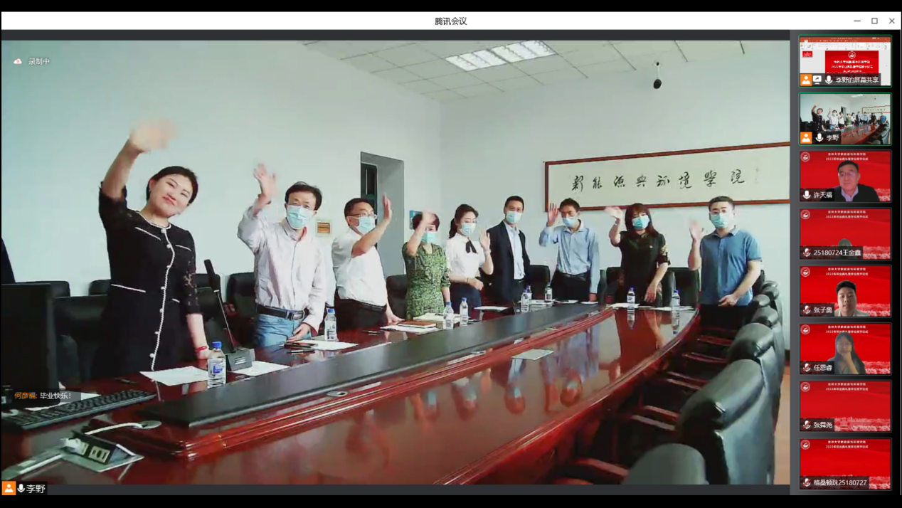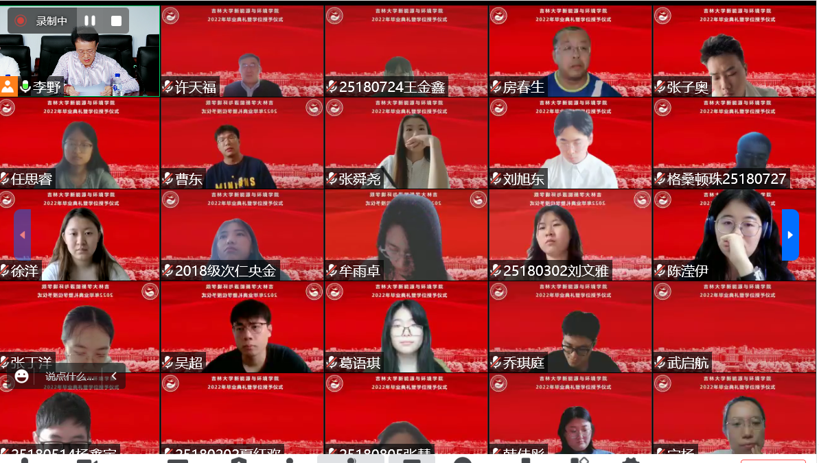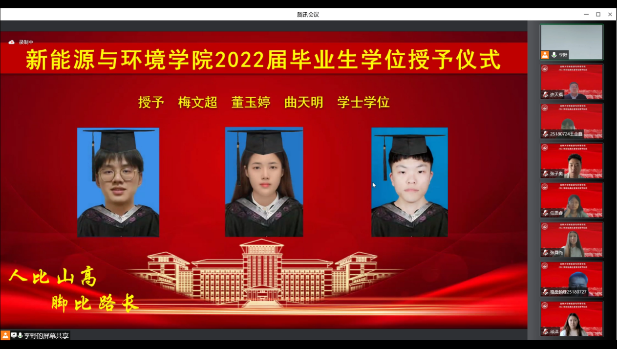 会议开始前,播放了毕业生在校期间的视频和照片,一幅幅照片、一个个镜头、一段段音乐勾起了老师和同学们美好的青春回忆。在师生们的期待与感动中,典礼正式开始。首先,全体起立奏唱《中华人民共和国国歌》。随后,花修艺教授和卞建民教授宣读了公司2022届毕业研究生和本科生名单,并对顺利毕业的同学表示祝贺。接着,同学们期待的学位授予仪式开始了,本次学位授予仪式采用线上制作动图的方式为毕业生拨穗。