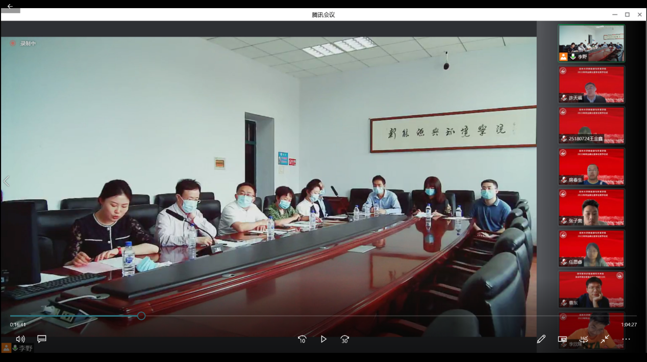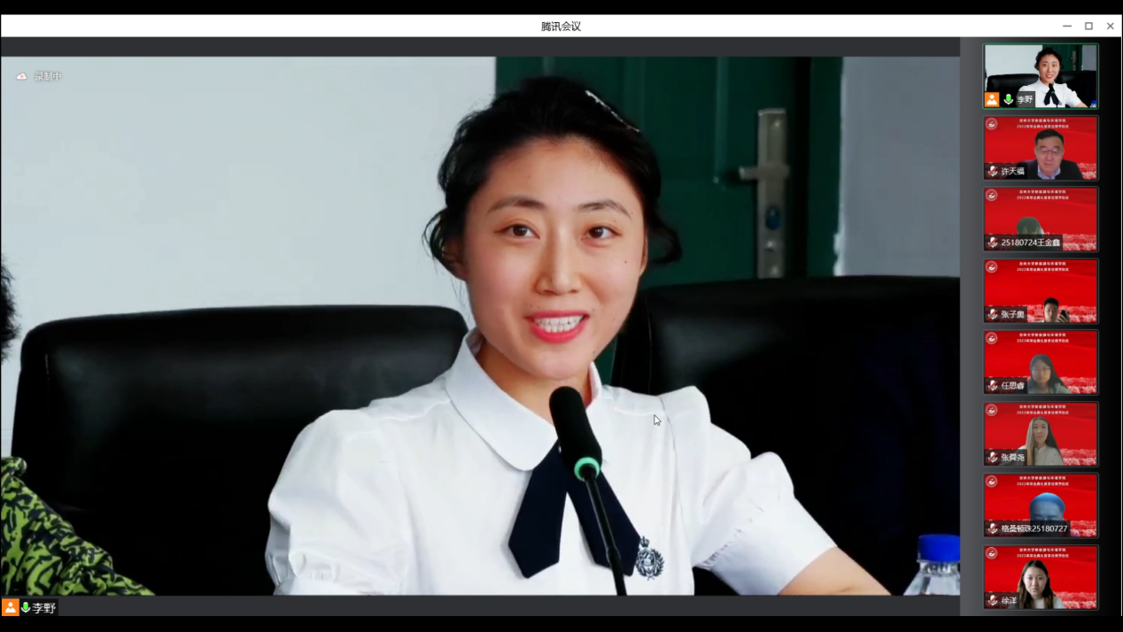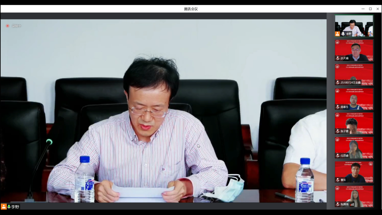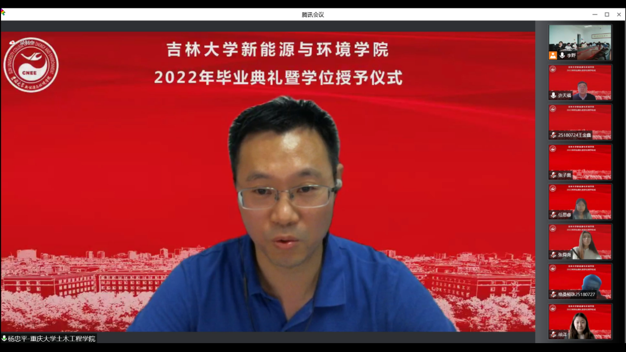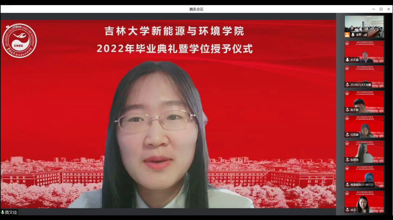 会议开始前,播放了毕业生在校期间的视频和照片,一幅幅照片、一个个镜头、一段段音乐勾起了老师和同学们美好的青春回忆。在师生们的期待与感动中,典礼正式开始。首先,全体起立奏唱《中华人民共和国国歌》。随后,花修艺教授和卞建民教授宣读了公司2022届毕业研究生和本科生名单,并对顺利毕业的同学表示祝贺。接着,同学们期待的学位授予仪式开始了,本次学位授予仪式采用线上制作动图的方式为毕业生拨穗。