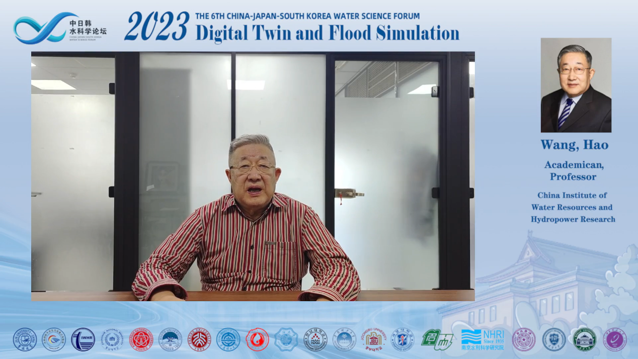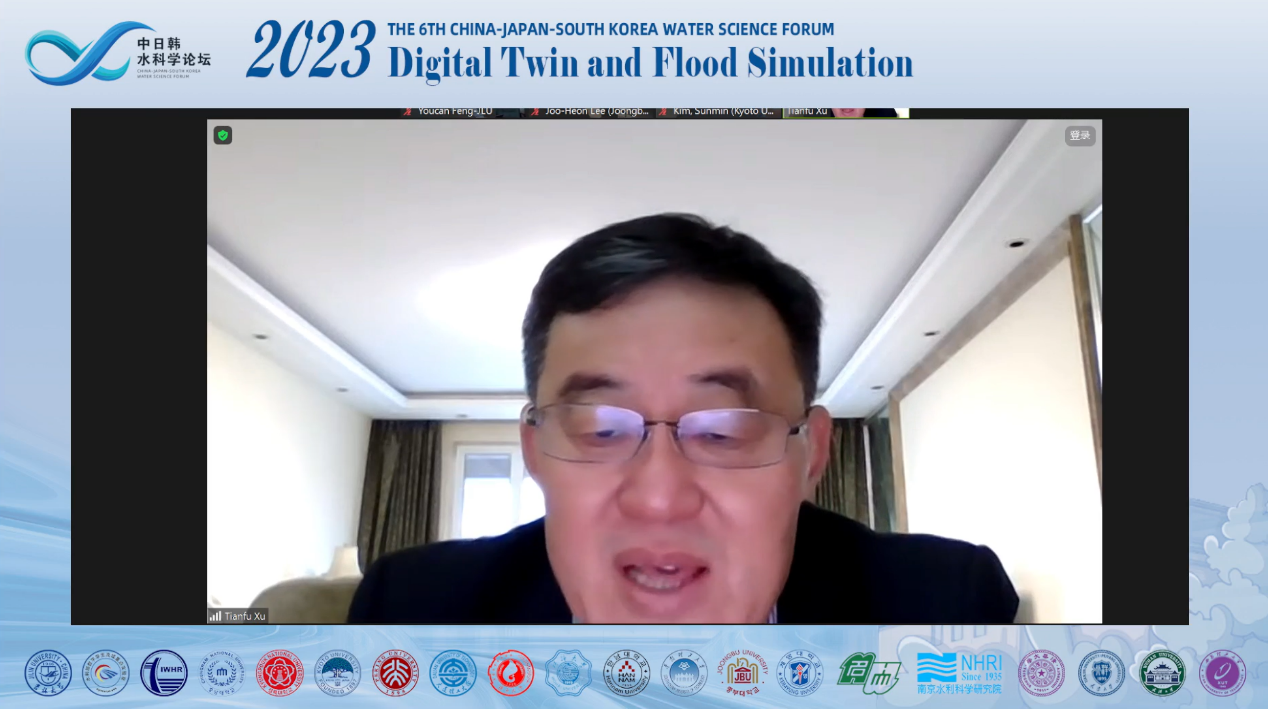 论坛首先由经理许天福教授致欢迎词,王浩院士作为学术委员会主席阐述了中日韩科学家开展深入交流和探讨的重要意义,指出“中日韩三国同属季风气候区,降雨时空分布不均,汛期雨量集中,长期遭受严重洪涝灾害,近年来,在气候变化影响下,极端暴雨频发,洪涝灾害加剧,进一步加强数字孪生与洪涝模拟相关科学研究十分必要”。王院士希望各国科学家贡献智慧、互学互鉴、促进交流、加强合作,为建设美好、宜居的地球家园和构建人类命运共同体贡献科技力量。线下会议由李鸿雁教授主持,线上会议由冯右骖副教授主持。