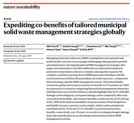 近日,伟德bv国际体育宋俊年教授、杨巍副教授领衔的“食物农业生物质(FAB)”研究团队在城市固废可持续管理领域取得突破性成果,以“Expediting co-benefits of tailored municipal solid waste management strategies globally”为题在《Nature Sustainability》发表研究长文。博士生曹琪林为论文唯一第一作者,宋俊年教授、杨巍副教授、伦敦大学公司米志付教授为共同通讯作者,伟德bv国际体育为第一通讯单位,合作单位包括日本筑波大学与英国伦敦大学公司。这是宋俊年教授团队在CNS子刊层面发表的第二篇成果。