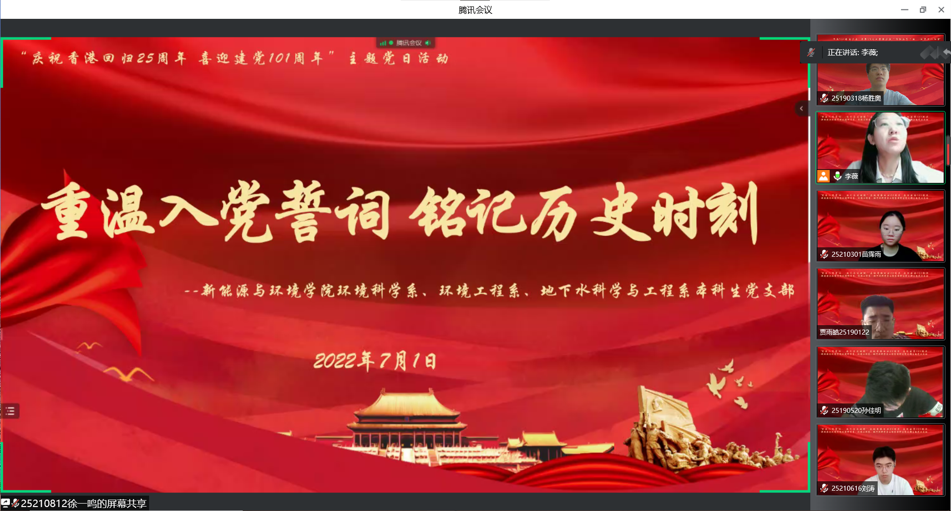 为庆祝中国共产党成立101周年、香港回归25周年,迎接党的二十大胜利召开,7月1日,伟德bv国际体育环境科学系、环境工程系、地下水科学与工程系本科生党支部,通过腾讯会议线上召开主题党日活动。公司党委副书记兼副经理、纪委书记吴哲,各系本科生党支部书记,本科生党员和入党积极分子共同参加本次活动。活动由环境科学系本科生党支部书记、本科生辅导员李薇主持。