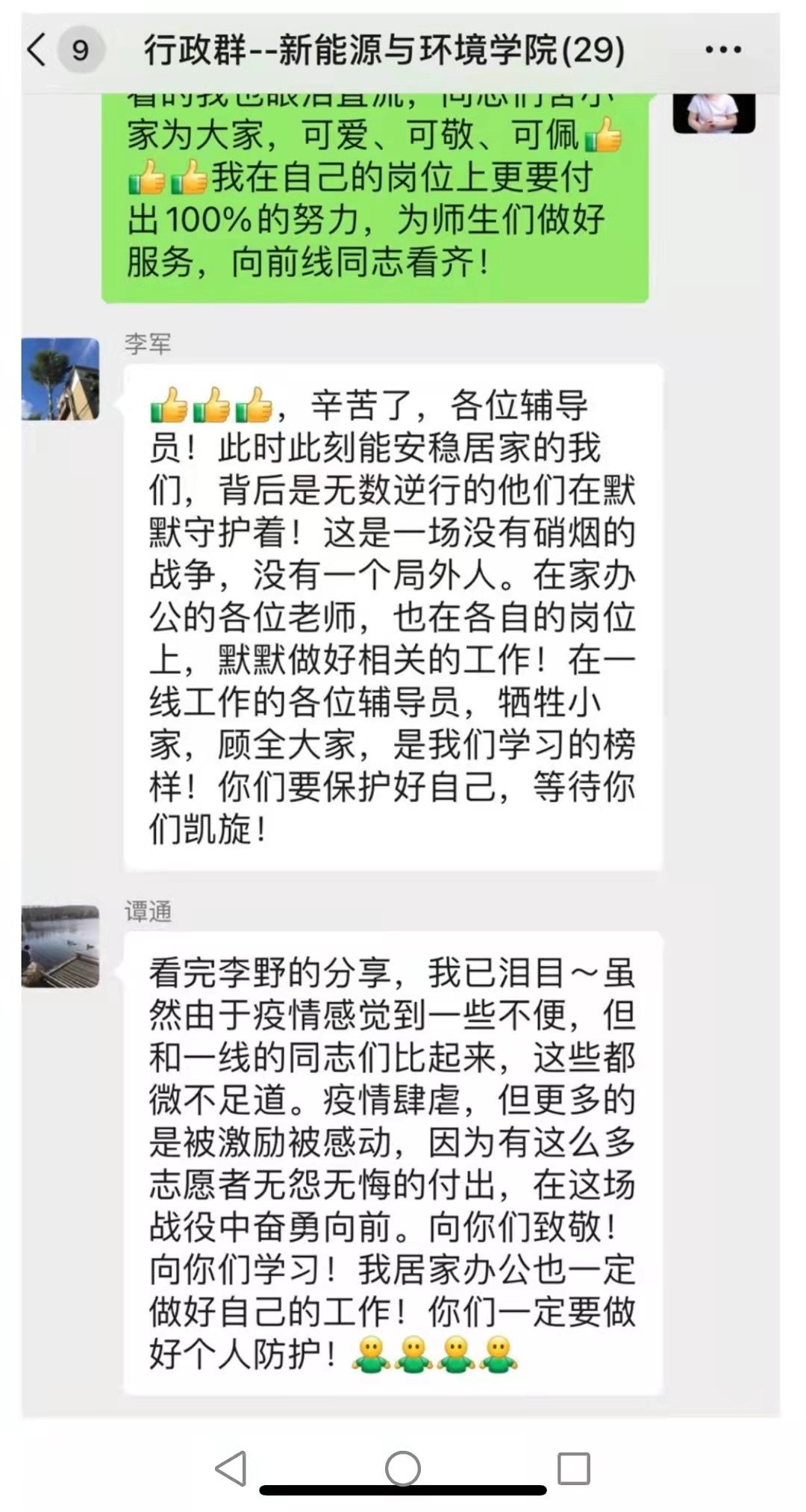 支部党员、前卫北区研究生一公寓楼长李野,分享了她的抗疫经历。她所在的楼有450名员工,作为一名还处于哺乳期的孩子妈妈,她在接到公司的号召后,义无反顾的加入了这场战役中,“舍小家保大家,离小孩陪大孩”这正是她的真实写照,每天早早起床准备各项事宜,忙完常规工作后已是深夜,全天24小时在线,员工有各种问题随叫随到。虽然困难重重,但她选择一一克服,作为一名共产党员,她恪尽职守,坚守着党员的初心,奋勇向前。