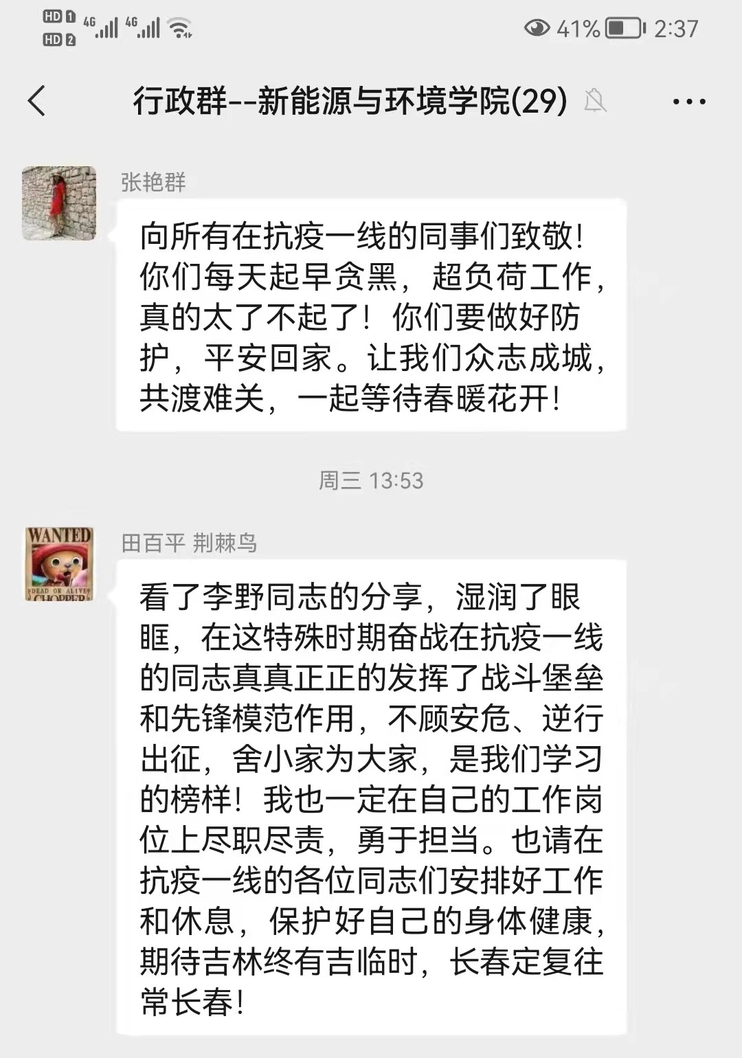 支部其他党员也分别结合居家办公和抗疫情况做了发言,大家都深受感动、备受鼓舞,纷纷表示要坚定信心、坚守岗位、服从管理,随时听候公司和公司的召唤,投入到抗疫一线的工作中去,也期待抗疫一线的同志们早日凯旋。