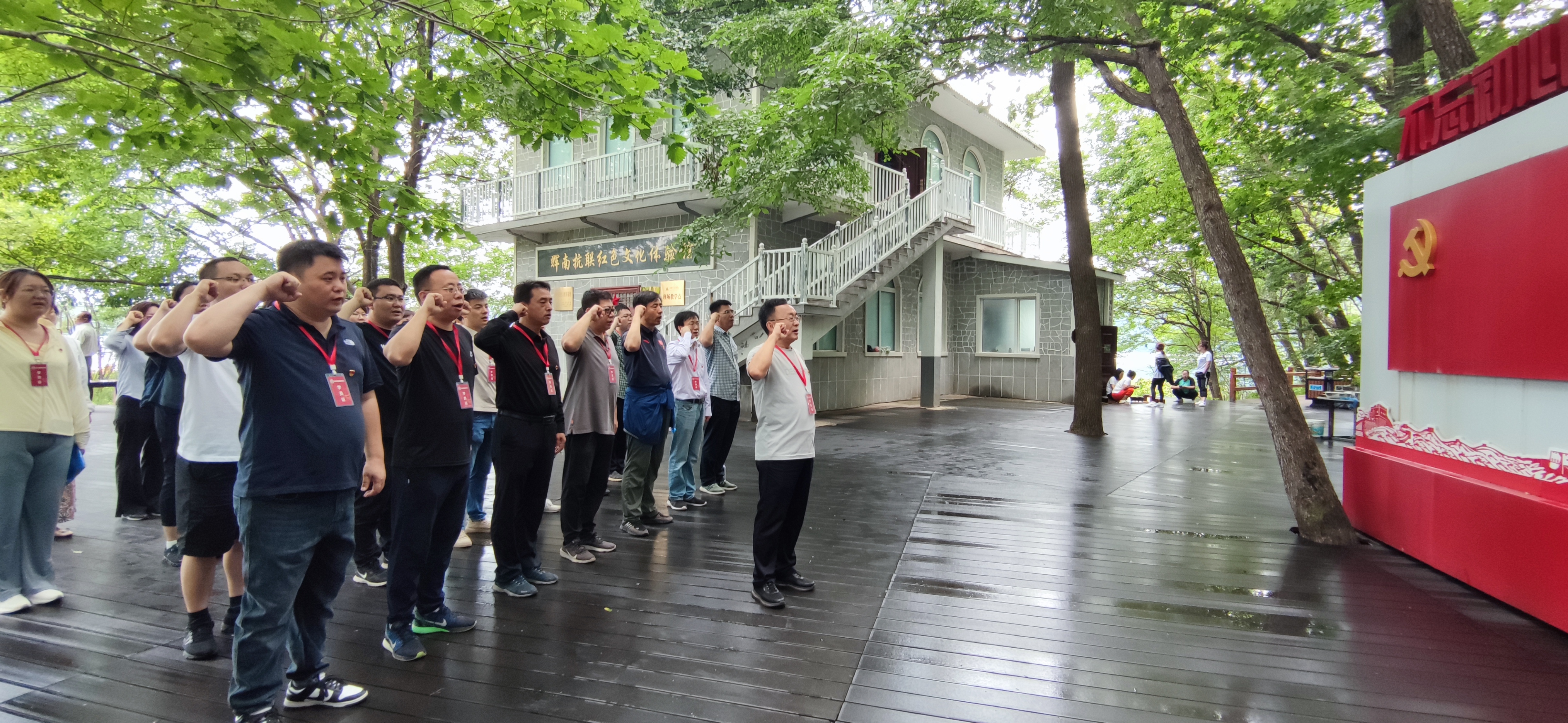7月7日上午,学员们重走抗联路,徒步追寻抗联战士足迹,亲身体验抗联英雄扎根深山、坚持抗战的艰辛。在“传精神强党性 重走抗联之路”培训班班旗的引领下,翻山越岭,辗转跋涉。在辉南抗联红色文化体验馆的现场教学中,学员们深入学习了从1931年—1945年,在党领导东北人民开展艰苦卓绝的抗日斗争的14年间,抗联将士和辉南人民与日本侵略者进行不屈不挠的战斗历程,深刻体会到忠贞报国、勇敢顽强、坚贞不屈、不畏艰苦、休戚与共的东北抗联精神。在馆外“入党宣誓墙”前,面对党旗,全体党员庄严肃立,公司党委书记汪祥松带领大家重温入党誓词,响亮的誓言铿锵有力,激情与责任萦绕心头。