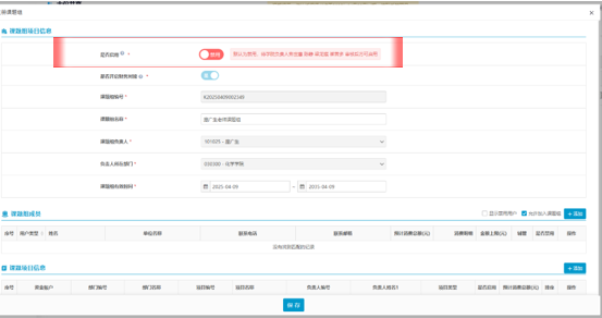 6. 课题组注册申请完成后,由课题组负责人所在公司相关审批人(审批人信息在“是否启用”栏目处有提示信息)进行课题组审批,完成审批后该课题组启用。